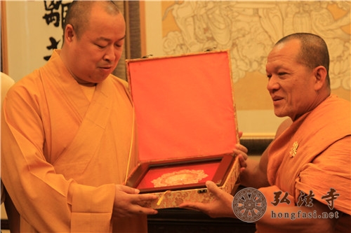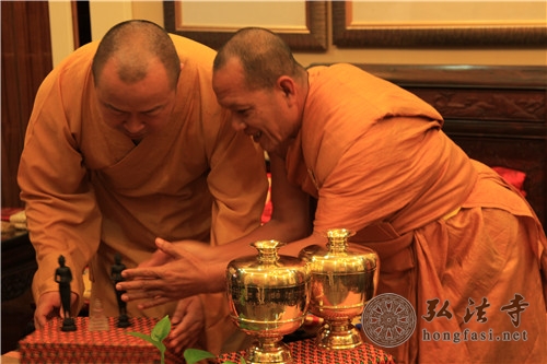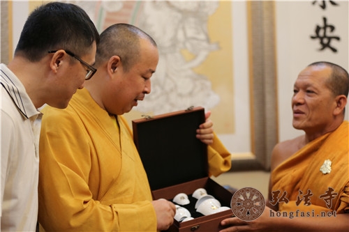 上午10时许,印顺大和尚亲自迎接柬埔寨隆庞僧王一行,双方于弘法寺接待大厅进行了亲切而友好的会谈。期间,印顺大和尚介绍到,弘法寺的开山祖师上本下焕老和尚修行艰苦卓绝,证道上不可思议。老和尚在圆寂前一年就对寺庙大小人事悉作安排,而本老荼毗后全身皆是舍利,头骨、臂骨、腿骨等处全部完整,舍利子不计其数,形状各异,五彩斑斓,让人惊叹。中外400余座庙宇先后迎请老和尚舍利安奉,其中泰国大皇宫自康熙年间至今几百年再无兴建建筑,但专门建塔祈请本老舍利赴泰国大金山寺、郑王庙、素可泰府等地永久安奉,为泰国人民加持。