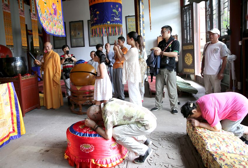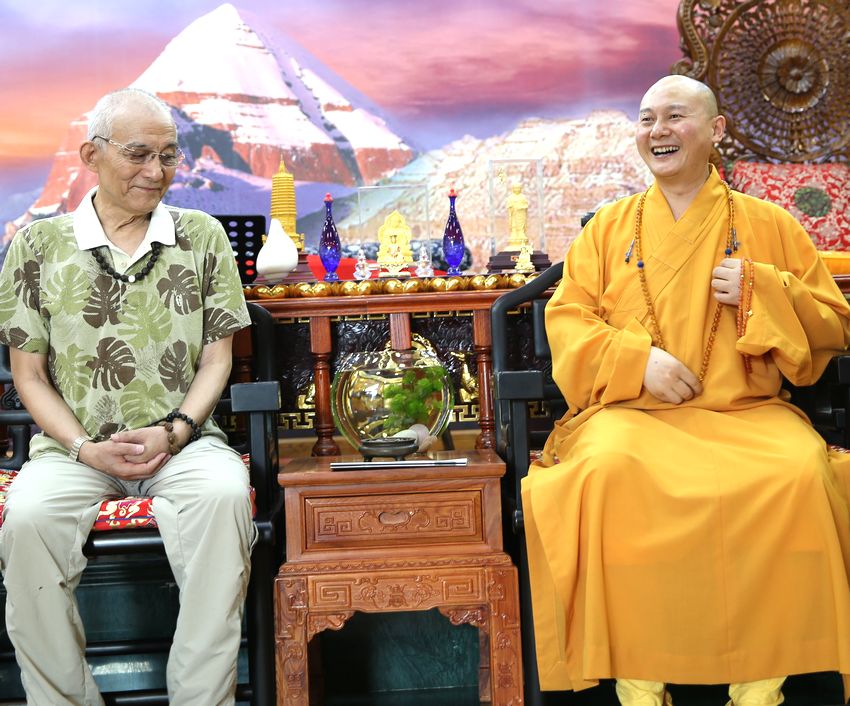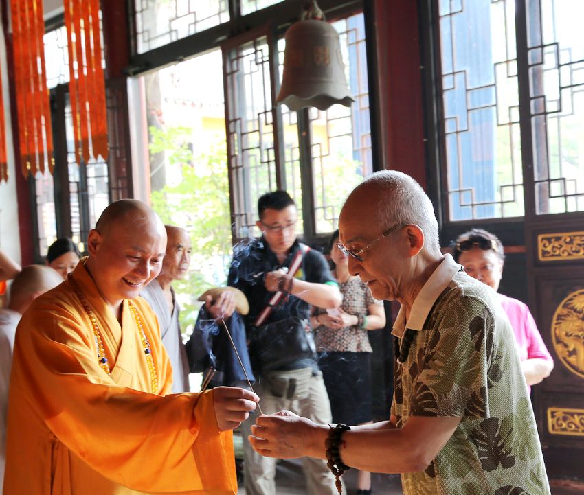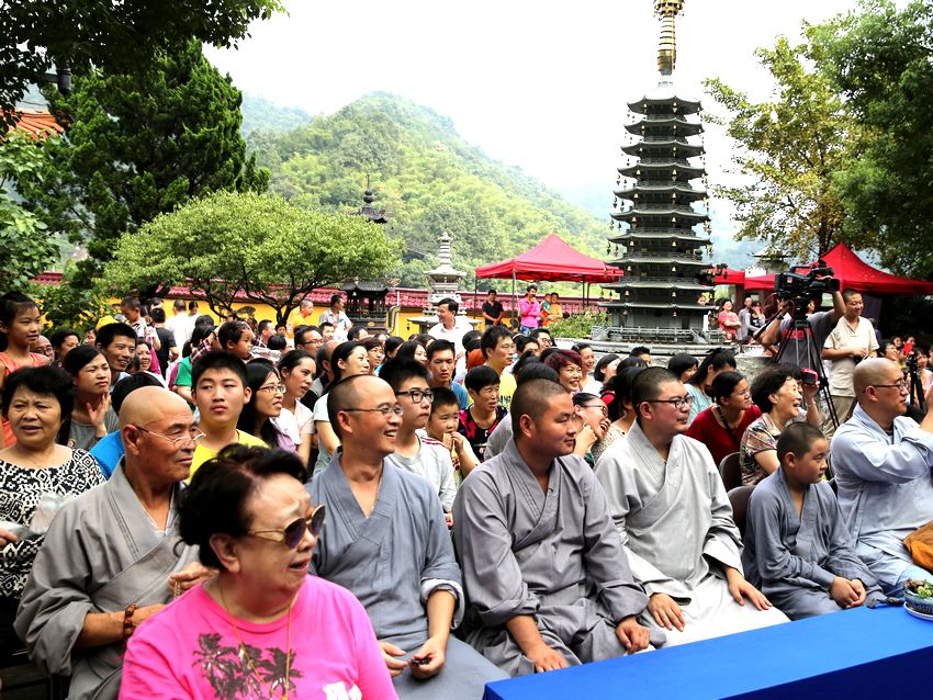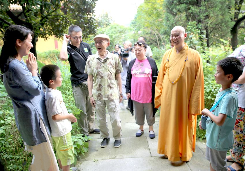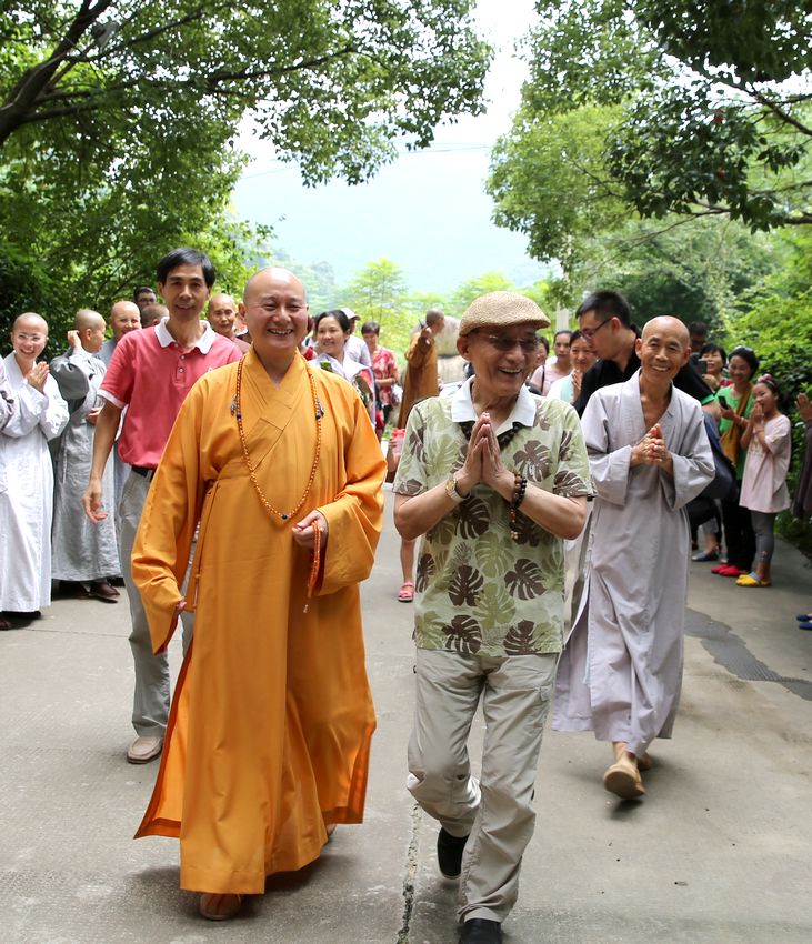 上传下喜法师以及四众弟子热烈欢迎著名表演艺术家”济公“扮演者,81岁高龄的游本昌老师,率团在宁波慧日禅寺演出话剧《济公办学》