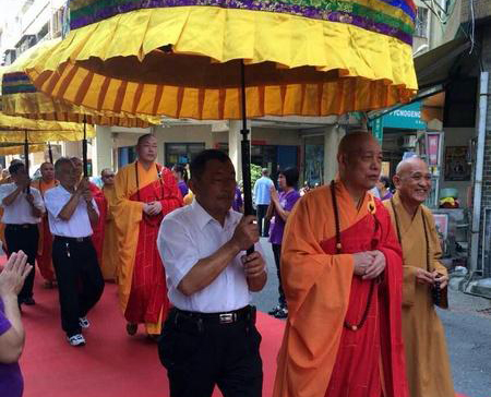 “南海观音 慈应宝岛”观音宝像安奉祈福法会在台湾高雄宏法寺举行。10月16日上午风和丽日、天高云淡。普陀山佛协道慈法师和高雄宏法寺住持圆尘法师等两地14位法师共同主法。