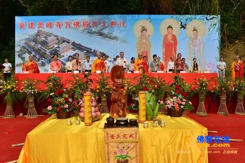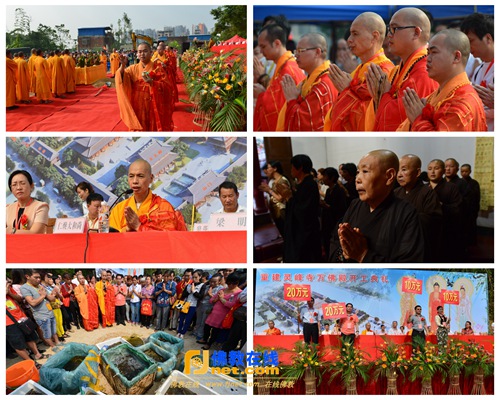 2014年10月14日上午,农历九月二十一,广西省防城港市防城区重建灵峰寺万佛宝殿开工奠基法会隆重举行。省内外的高僧大德、防城港市相关领导、来自各地的四众弟子、友好寺院代表共同参加了法会,整个法会以杨枝净水清净坛场,以梵唱佛音庄严道场,仪轨如法如律,人天欢喜。