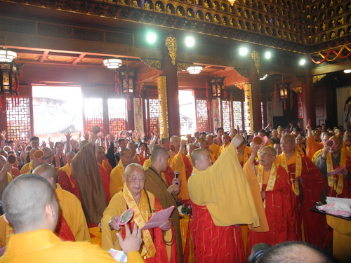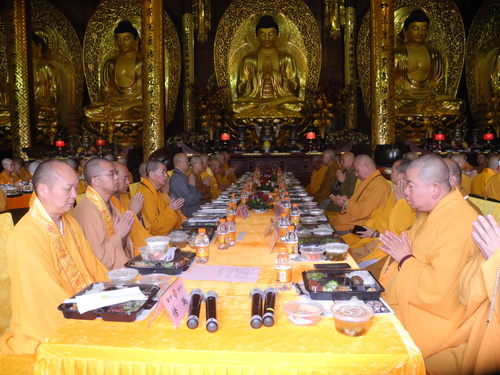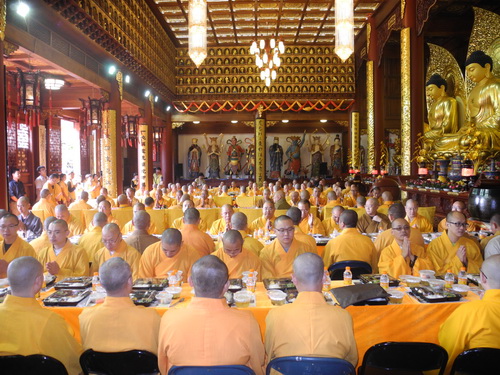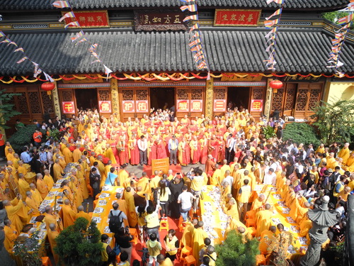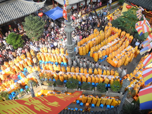 上午10时38分,西林禅寺举行“上堂供、千僧斋”盛会。在仪仗队迎请下,觉醒大和尚、无相长老、照诚大和尚、光慧大和尚、耀智大和尚上堂说法。主法法师高登法座,率众法师为设斋善信诵经祈祷。祈愿:世界和平、国泰民安、正法久住、灾障消除。上堂供圆满后举行了千僧斋宴,来自全国各地的1000多位僧人一同诵经祈祷,虔诚念诵佛号,场面极其壮观,广大护法善信被庄严盛大的场面感染,纷纷发心供养三宝,广种福田。整个过程如法如律,殊胜无比。
