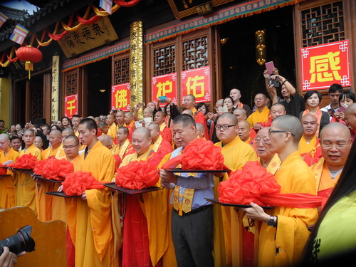 悟端大和尚宣读广东省佛教协会会长、光孝寺方丈明生大和尚,浙江省佛教协会会长、雪窦山资圣禅寺方丈怡藏大和尚发来的贺电;广东省佛教协会副会长、广州市佛教协会会长,大佛寺方丈耀智大和尚代表诸山长老致辞:“西林禅寺今天迎来了五方五佛、五百罗汉开光暨悟端大和尚升座十周年庆典盛会。在此,我谨代表莅临盛会的诸山长老对法会的隆重举行表示最热烈的祝贺并深信祝愿,悟端大和尚一定会带领寺院广大僧众,认真贯彻执行党的宗教政策,高举爱国爱教和团结进步的大旗,不断加强佛教的信仰建设、道风建设和人才建设,大力弘扬我国佛教文化。最后,他祝西林禅寺道场兴隆,佛日增辉!祝各位领导,诸山长老,大德法师,护法居士们,身体健康,吉祥如意”。西林禅寺护法居士、千僧斋功德主、企业家代表赵辉,原上海市民宗委副主任、上海文史馆馆长吴孟庆分别发表讲话。最后,松江区委常委、统战部部长李群策先生致辞:“首先,对于西林禅寺举行五方五佛、五百罗汉开光暨悟端大和尚升座十周年庆典法会表示热烈的祝贺,同时希望西林禅寺在悟端大和尚的带领下继续在党的宗教政策的光辉照耀下,高举爱国爱教伟大旗帜,本着慈悲喜舍、理事无碍的精神,服务社会,正信正行,承前启后,继往开来,与祖国同行,与时代同步。为促进经济发展、社会和谐、文化繁荣、生态文明,为实现中华民族伟大复兴的中国梦贡献智慧和力量”。李部长讲话后,觉醒大和尚、李群策部长、何健处长等20位高僧大德、领导嘉宾、护法居士共同为“五方五佛、五百罗汉开光暨方丈升座十周年”庆典剪彩,顷刻,礼炮齐鸣,众人欢呼。