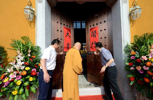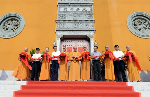 2014年9月29日,普陀山秋高气爽,佛光普照。上午9时,普陀山大乘禅院在刚刚修复落成的山门前隆重举行山门开门典礼暨剪彩仪式。