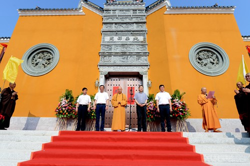 仪式最后进行山门开门剪彩仪式,忻海平部长、道慈法师、蒋志伟主任、邱平海局长、丁宏斌副主任为剪彩仪式剪彩。剪彩仪式结束,忻海平部长、道慈法师、蒋志伟主任等出席仪式领导共同主持为大乘禅院开启山门。