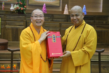 心茂法师、明空法师等人表示参观新建后的鸿山寺令人十分惊喜,赞叹法云法师发大心愿,以智慧和坚韧的毅力构建出极具艺术特色的佛教寺院。心茂法师还向大众介绍了法云法师的恩师——上妙下华长老与台湾佛教的渊源,并表示期待明年鸿山寺的落成大典。 最后鸿山寺常住与心茂法师一行互赠礼品。