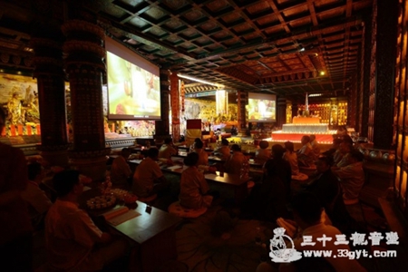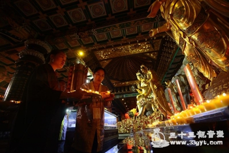 10月11日晚上20时30分,在法师的主持下观音法会在三十三观音堂内堂隆重开始。此时梵音缭绕,佛号长鸣。在观音内堂设有供灯坛场,并在法师诵经加持之下,所有与会斋主将依照法会仪轨由佛堂居士引领分别向三十三观音菩萨敬献佛灯。一灯能破千年暗,一智能灭万世愚,佛前供灯一盏,积无量功德,消无量业障,值此殊胜之日,增无上功德不可思议。