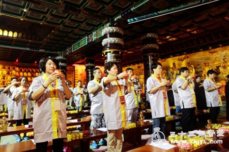 9时30分,参与法会的斋主又于三十三观音内堂举行了上供法会,法会由南山寺法师主法拈香,率领居士信众以灯香花果品,梵呗雅韵供养十方诸佛菩萨,并将此诸功德,悉皆回向法界一切有情,共同祈愿世界和平,国泰民安,人民六时吉祥。