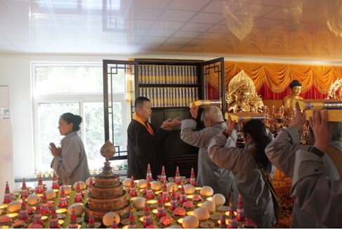 揭牌典礼开始前,竹林寺住持普照大师以及全体法师和居士、到场信众首先进行请乾隆大藏经仪式,全体成员绕天王殿、地藏殿等殿堂最终达到楞严坛,将乾隆大藏经虔诚请到竹林寺内。