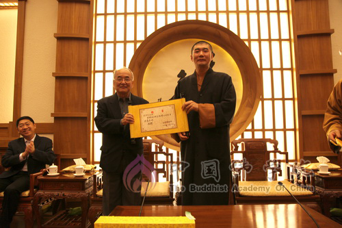 湛如法师在讲话提到,受院长传印长老委托,对莅临颁聘任仪式的赵忠海副司长、赵红宇处长表示感谢!对能受聘担任中国佛学院博士研究生导师的教授表示感谢!随后详细介绍了受聘博士研究生导师的简历。最后,湛如法师为受聘的博士研究生导师颁发了聘书。