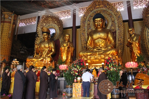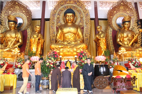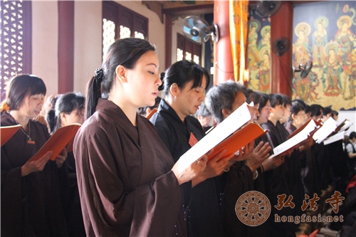 上午8点整,法会开始。大雄宝殿香烟袅袅,花果供献,弘法寺两序大众和护法信众依礼站班,肃穆庄严,神情恭敬,在维诺师的引领下,法师、护法一一礼拜,与会大众共同持咒诵经。阳光普照,梵乐安详,僧众一唱三叹,如法如律。