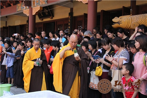 2014年10月12日是观世音菩萨出家日,又逢本寺开山祖师上本下焕老和尚108诞辰之际,在这个特殊的日子,弘法寺隆重启建观音菩萨出家日拜忏法会和慈悲放生法会,以此殊胜功德回向世界和平、国泰民安;祈愿本焕长老乘愿再来、普度众生,祈愿大众福慧双增、精进修道、速登菩提、圆成佛道。
