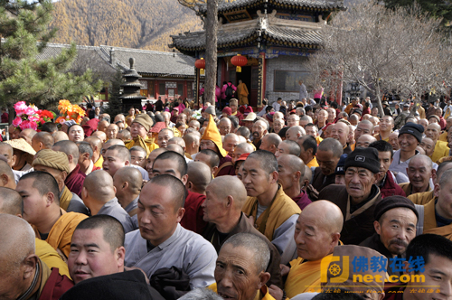 日晕辉耀,清凉逼人。2014年10月20日,素有小朝台之称的黛螺顶大雄宝殿内外经声如涛,梵音阵阵,来自五台山全山寺院的千余僧众在簌簌秋风中合十祈福世界和平,人民安康。五台山佛教协会会长、黛螺顶住持昌善法师亲自主法,全国各地的数百名游客有幸参加,共沾法喜。