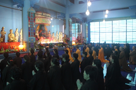 忠明法师引领了藏法师一行依次参观了护法殿、大雄宝殿、药师密坛等石室禅寺重要堂口景观;其间,忠明法师为了藏法师一行介绍了石室禅院历史及药师佛文化的弘传等相关情况。随后大家来到药师密坛,忠明法师与了藏法师一行一同参加石室禅寺正在进行的49昼夜精进祈愿药师佛念佛大法会,共祈国泰民安,法轮常转。