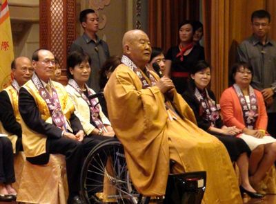 出席祝贺的吴敦义表示,佛光会众都是崇敬大师的胸怀,发菩提心、行菩萨行。人间佛教的真义,他简单归纳就是大师推动的“三好”与“五和”,现今社会有很多天灾、人祸,这是净化人心与社会的灵药,与大同世界的理念也可说是“心心相印”。