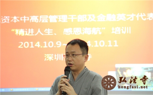 2014年10月10日上午九点,中国佛教协会副会长、海南省佛教协会会长、深圳弘法寺方丈印顺大和尚于弘法寺佛学院四号教室为海航集团企业家的学员们做了主题为《精进人生》讲座。
