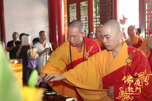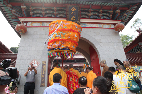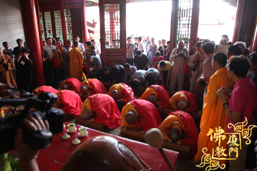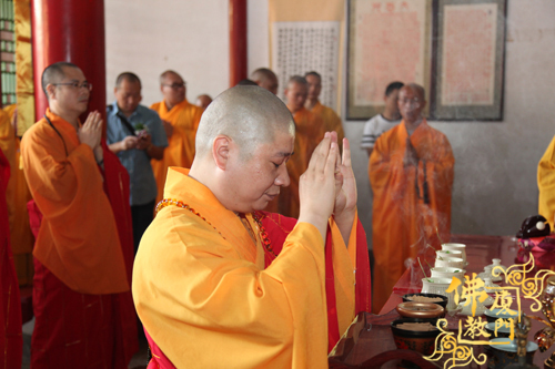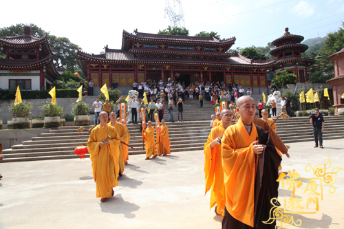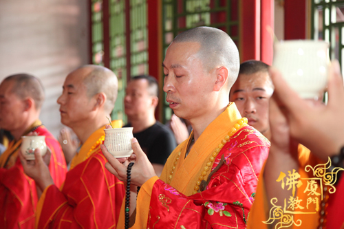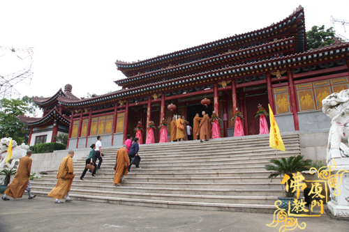 随后,寺内钟鼓齐鸣,南普陀寺知客悟云法师带领仪仗队前往山门迎请德煌法师晋院。德煌法师在弟子们的簇拥下缓步前行,行至天王殿弥勒菩萨、韦驮菩萨、伽蓝菩萨前分别拈香至诚顶礼。在金仙岩大雄宝殿内,则悟大和尚、定恒法师、界象法师、德辉法师、广宗法师、慧然法师、仁慈法师、明德法师共同主法,为德煌法师晋院庆典诵经祈福洒净,与会嘉宾随喜参加。