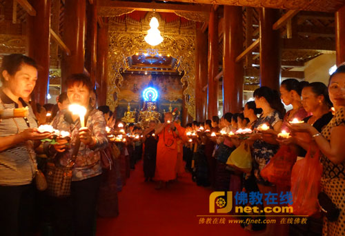 佛历2558年,南传佛教解夏安居法会在云南西双版纳总佛寺举行。2014年10月9日晚,西双版纳总佛寺举行了点灯祈福法会,祜巴龙庄勐大长老带领僧团与来自各个寨子的信众一起点燃莲花灯,为大家祈福。