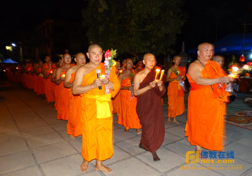 祜巴龙庄勐大长老带领僧团与来自各个寨子的信众一起点燃莲花灯