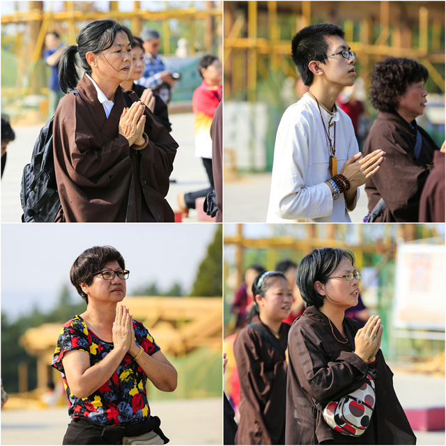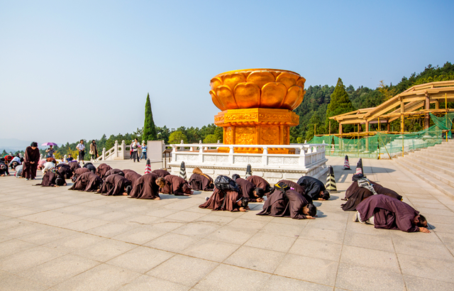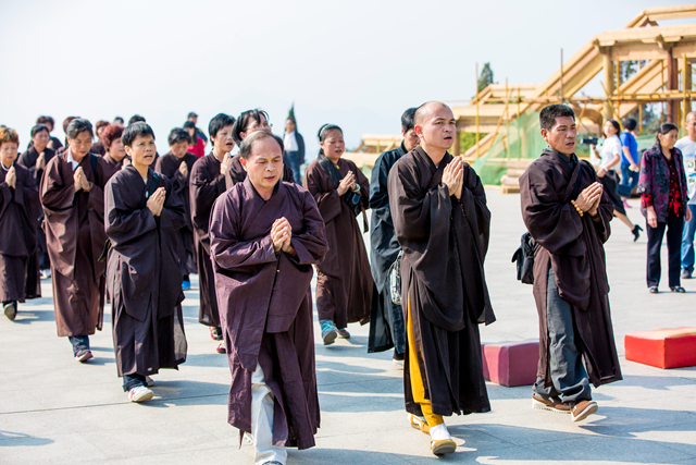 早斋之后,大家在导览大厅聆听了义工关于阿弥陀佛圣像及净土苑的概要讲解。然后,在传品法师带领下,佛弟子们身着海青,自信愿路开始,称念弥陀圣号,三步一拜至拜佛台。最后,在拜佛台忏悔业障,发愿往生。
