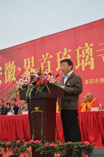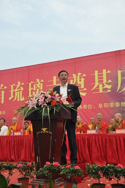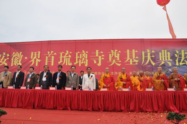 上午9时,界首琉璃寺奠基庆典正式开始,庆典由庐江佛协会长开慧法师主持,首先,全体起立奏国歌,现场庄严肃穆,与会大众法喜充满。莅临莅临奠基庆典领导嘉宾有:阜阳市人大副主任王健康先生,阜阳市政协副主席张友谊先生,阜阳人大民宗侨外工委副主任李皓先生,阜阳政协民宗委主任马新华先生,阜阳市委统战部副部长、宗教局局长齐超先生,阜阳市宗教局宗教科科长鲍梅女士,阜阳市颍州区宗教局局长胡春田先生,界首市人大主任范力先生,界首市政协主席王子臣先生,界首市常务副市长杨增泓先生,界首市统战部常务副部长李顺民先生,界首市统战部副部长、宗教局局长梁志先生,以及界首市田营镇的领导嘉宾等。