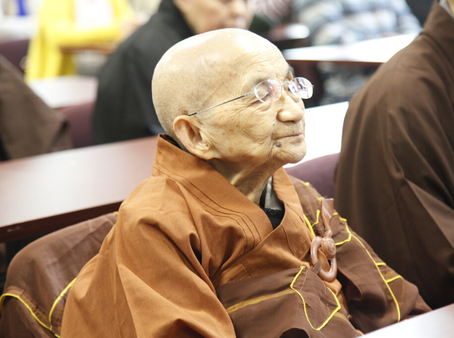 湖北省佛协咨议委员会主席、莲溪寺退居主持94岁高龄的慈学老法师莅临讲座现场