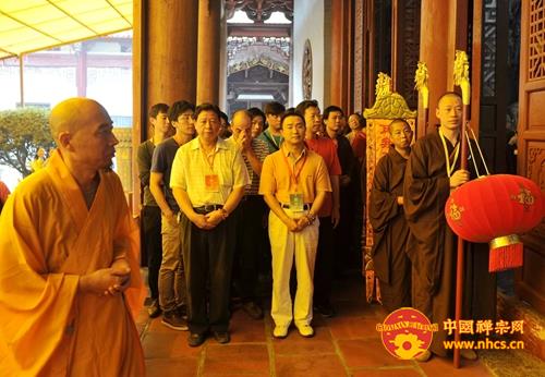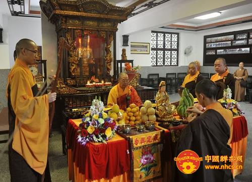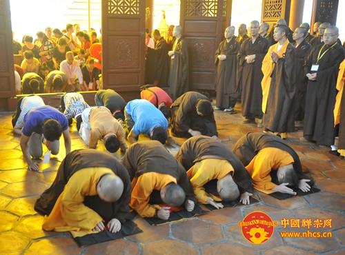 上午十时左右,众新戒比丘于大雄宝殿整齐排班,诸位功德主于大殿前合掌分列。照贤法师引领八位功德主随着仪仗队前去迎请传正大和尚登坛主法。传正大和尚落座后,引礼法师和功德主依次跪拜拈香,侍者展具跪拜。一切如法就绪后,大和尚拄杖震地、手执如意,开始说法,诸戒子和功德主无不欢喜听受。