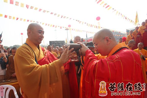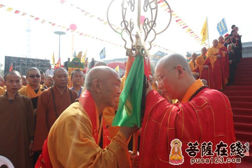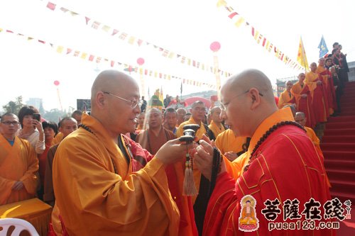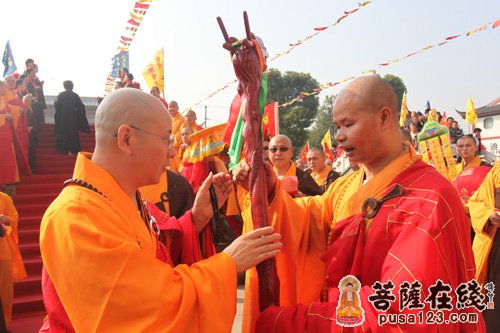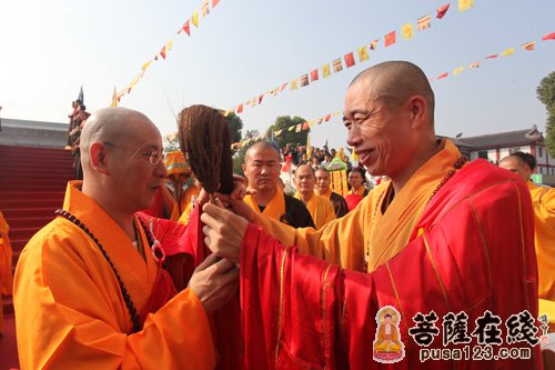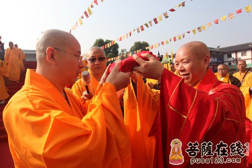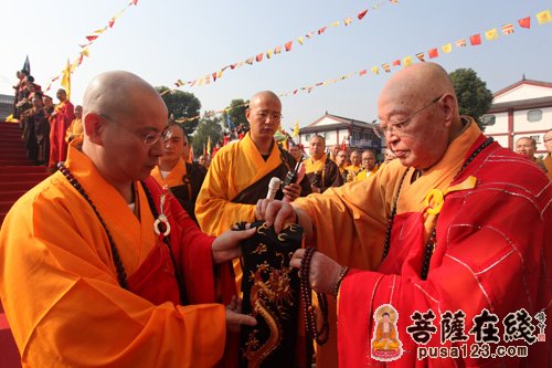 上午9时,恭请高僧大德加持法物并致送予新任方丈广德法师。中国佛教协会副会长、江苏省佛教协会会长、镇江金山江天禅寺、焦山定慧寺方丈心澄大和尚为广德法师授祖衣,中国佛教协会副会长、江西省佛教协会会长、南昌佑民寺方丈纯一大和尚为广德法师挂佛珠,上海市佛教协会名誉会长妙灵长老为广德法师授具,上海市佛教协会副会长、静安寺方丈慧明大和尚为广德法师授钵,上海市佛教协会副会长光慧法师为广德法师授拂尘,浙江省佛教协会副会长、杭州市佛教协会会长、灵隐寺方丈光泉大和尚为广德法师授如意,江西省佛教协会副会长、云居山真如寺方丈纯闻大和尚为广德法师授龙杖,江西省佛教协会副会长、永宁寺方丈证通大和尚为广德法师授锡杖。