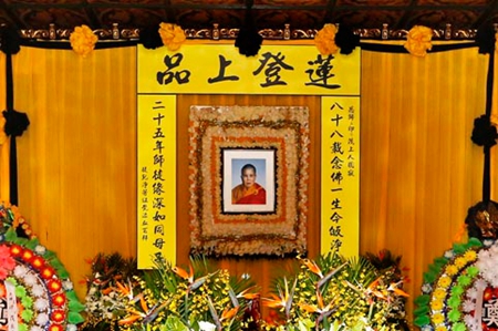 在灵堂遗像两旁,净芳法师撰联:“八十八载念佛一生今皈净土,二十五年师徒缘深如同母子。”以此表示深切悲痛和怀念之情。