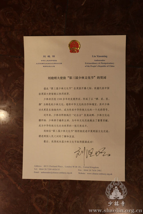 中国驻英国大使馆刘晓明大使为第三届(欧洲)少林文化节发来的贺信