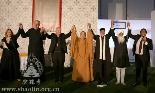 永信方丈与各宗教负责人牵手高举,一起发愿为世界宗教的和合共生作贡献
