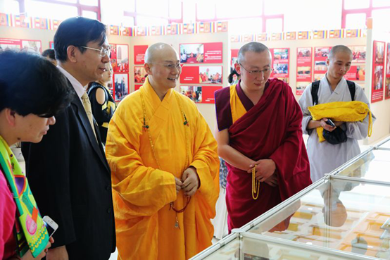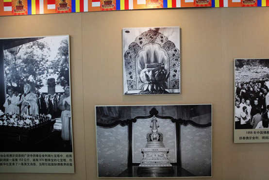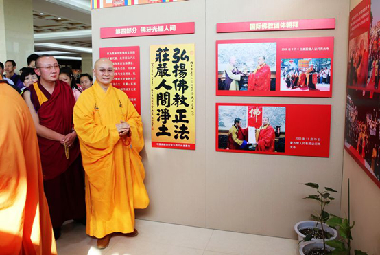 传喜法师驻足,仔细观看毎一幅图舍利片。图片展由舍利文化、佛牙出访情况、佛牙文化交融、佛牙光耀人间四个部分组成。