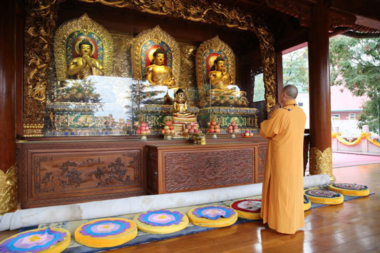 大家随同传喜法师一起在本师释迦牟尼佛、东方琉璃药师佛和西方极乐世界阿弥陀佛三尊金制佛像前,屏息凝视,至心礼拜。大家共同祈福:“南无本师释迦牟尼佛—南无本师释迦牟尼佛—南无本师释迦牟尼佛!自皈依佛,当愿众生,体解大道,发无上意!自皈依法,当愿众生,深入经藏,智慧如海!自皈依僧,当愿众生,统理大众,一切无碍。和南圣众!愿我们的祖国国泰民丰,风调雨顺,世界和平!”