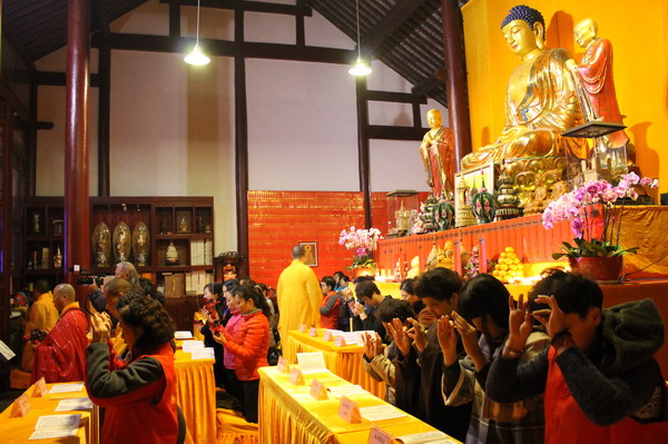 2014年11月11日(农历闰九月十九)凌晨,江苏省南京清凉寺举行了一年一度的众姓供佛、斋天法会,感恩十方三宝、诸天护法,祈愿祖庭兴盛、海众安和。坛场敬设二十四诸天牌位以及诸天供桌,恭敬迎请礼拜佛、菩萨、声闻缘觉、历代祖师圣众;祭祀法界诸天、大梵天、帝释天、护世四天王、金刚密迹、散脂大将、天龙八部、名山大川等一切神祗。百余信众随缘参与,身心庄严,法喜充满。