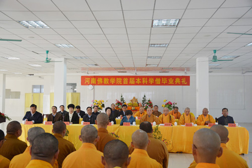 2014年11月6日,河南佛教学院隆重举行首届本科学僧毕业典礼。河南省宗教局局长彭亚平、副局长郭国志、一处处长孙儒起、办公室副调研员刘朝东、南阳市委常委、统战部长李建豫,南阳市政协副主席、市民族宗教局局长阿颖、调研员李万青,桐柏县委书记莫中厚,县委常委、统战部长陈明远,县政府党组成员王金绪等领导应邀出席典礼。河南省佛协会长、副会长、秘书长,河南佛教学院领导班子成员、全体师生和教职员工参加了本次典礼。