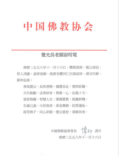 佛曆二五五八年十一月十六日,驚聞噩耗,覺公圓寂,哲人凋謝,哀悼曷極,我會全體同仁沈痛哀悼,謹呈唁辭,聊伸追慕: