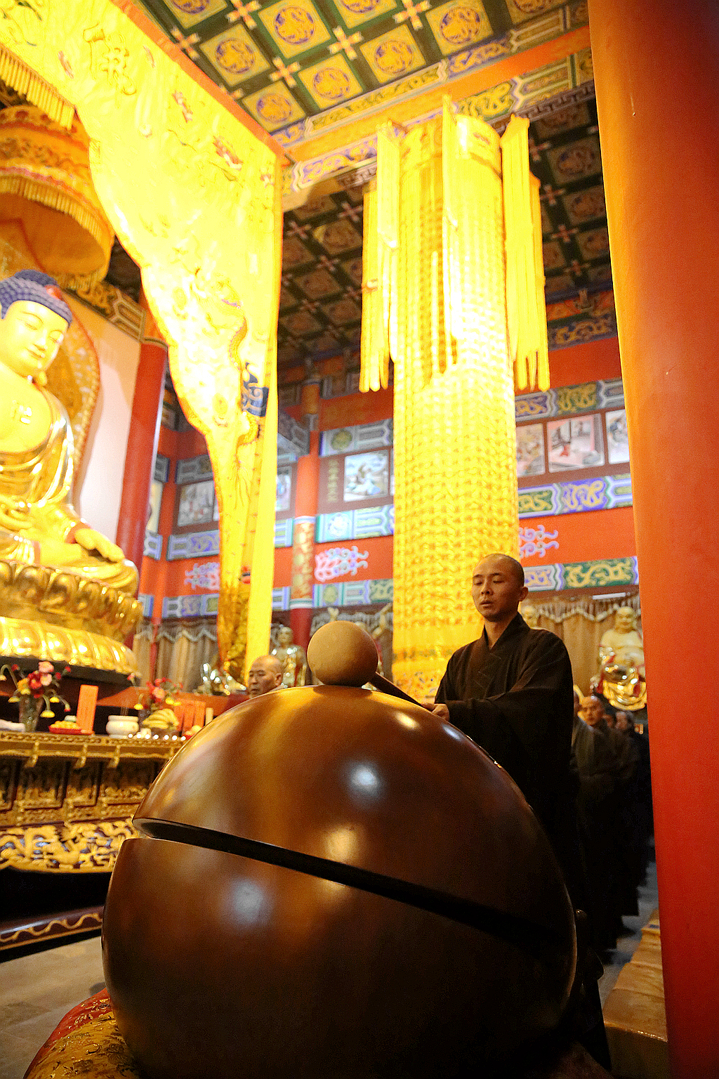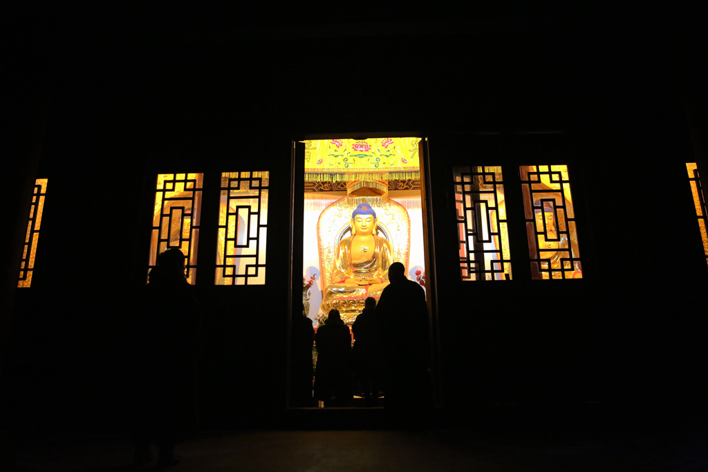 清晨举办吉祥普佛仪式,大雄宝殿内灯火辉煌,这是自常住入住以来,莲花源寺首次