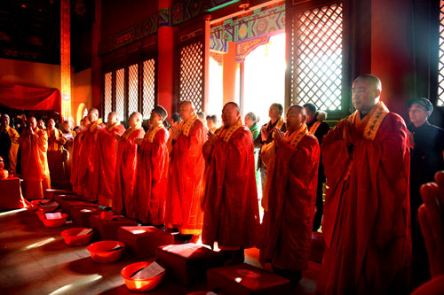 然后,诸山长老按照佛教传统仪规,在大雄宝殿,共同为佛像开光并祈祷世界和平,国泰民安。