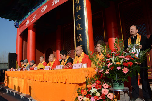 上午9时28分,鸣炮,钟鼓齐鸣,信众欢腾,诸山长老在宝鼎华盖的护送下走上主席台,庆典正式开始。郑子昌会长、赵卫民先生、何万斌先生、孟万胜先生、喻继安先生、仁昌法师、果光法师分别代表菏泽市佛教协会、菏泽市宗教部门、净土寺所在地政府部门、山东省佛教协会、徐州市佛教协会致辞。