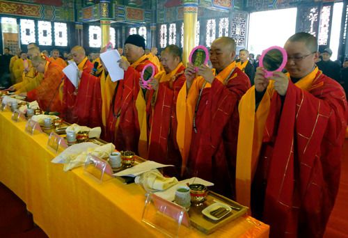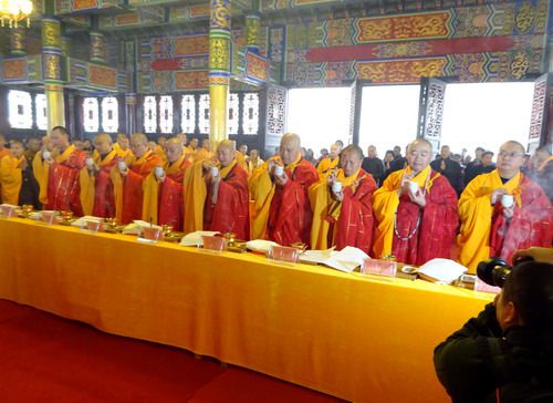 上午8点半,太阳初升,一行举着香案、宝盖、幛幡的四众弟子至德化寺山门迎请意寂法师、慧善法师、觉行法师、身祥法师、普正法师、智德法师、德道法师、克观法师、妙瓒法师到念佛堂举行开光仪式。随着维那德严法师一声恭请主法法师声响起,钟鼓齐鸣,仪式开始。