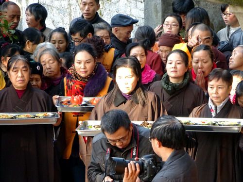 祝毕,维那师呼传供,八位居士供上一百零八样味供品,众念唱诵南无阿弥陀佛。法师塔前安位考食传供。祝念:觉灵寂灭,四大分张、六根清静证真常,一念悟生方,返照回光,逍遥到西方。(图、文:王中诠)