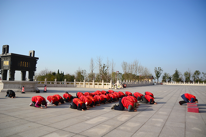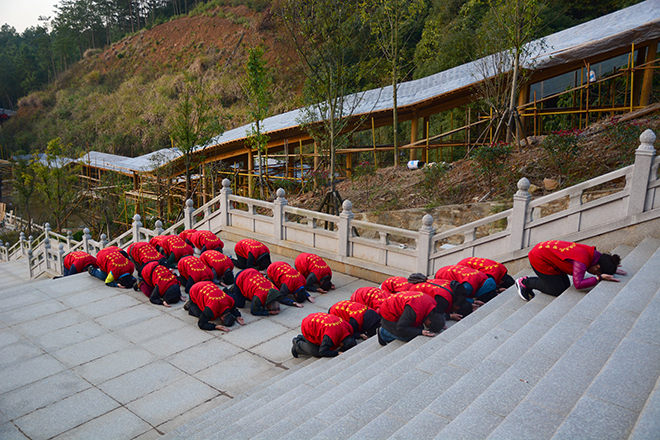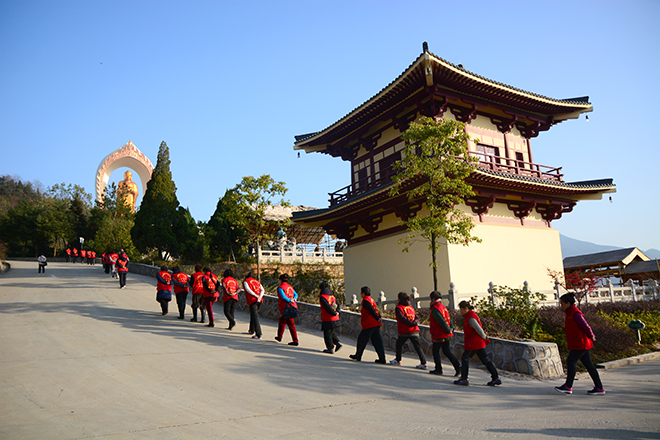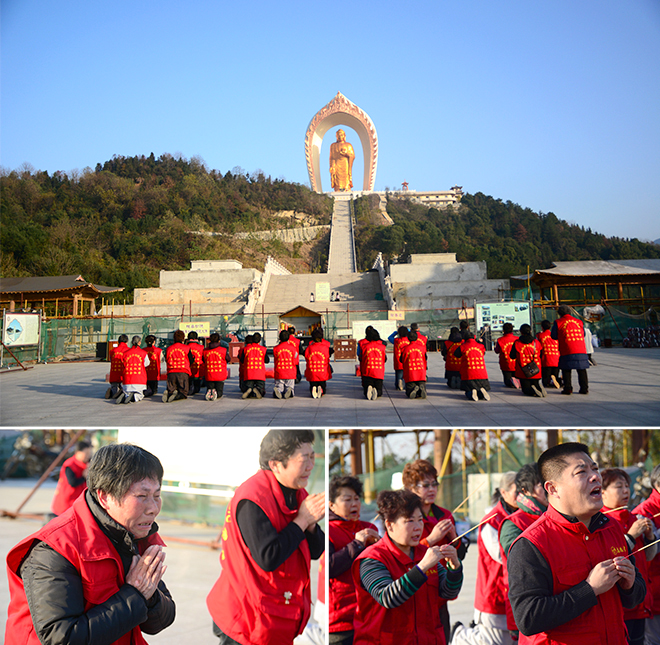 朝圣团统一着装,随众过堂后沿信愿路一步一拜,到达拜佛台,一边念着“阿弥陀佛,我错了”,一边泪流满面地拜上去。拜佛台做了简单的回向。然后沿山路行至大佛台,绕佛一匝,集体礼佛回向,整个过程庄严、至诚。在大佛台上,领队熊居士建议大家大声地把“阿弥陀佛”四个字喊出来,把“贪瞋痴”都喊出去,要把虚荣心、面子全踩在脚底下,发真诚心忏悔。大家都发愿,愿尽此身离娑婆,一定往生西方极乐世界!真诚感人的场面令很多游客赞叹不已。