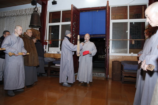 四祖寺作为禅宗祖庭,中兴以来已连续举办十二年冬季禅七法会,今年禅七期间,寺院继续开放两处禅堂供僧俗二众共修,且从今年开始,冬季禅七也将由原来的五个七增加为七个七。早课后大众在禅堂举行了起七传牌仪式,晚课后齐聚四祖殿和方丈室告生死假。晚18:30,由本寺方丈明基大和尚主持了起七仪式。