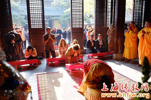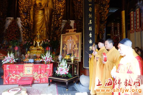 10时35分,龙华古寺方丈首座海晏长老登临三圣宝殿,拈香主法,率领十位法师执持法器,高唱佛偈,颂扬三宝,赞佛功德,为泰王诵经祈福。