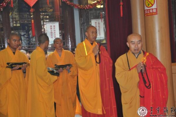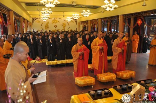 2014年11月29日,宁波市佛教居士林徐文芳林长偕同全体居士殷勤恭请浙江省佛教协会会长、雪窦山资圣禅寺方丈怡藏大和尚、后堂广能法师、监院持定法师莅临居士林为400余名在家信众传授三皈五戒。