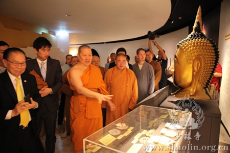 会谈结束后,在赵昆通猜法师(Phra Prom Mung Kla Chan)的带领下,永信法师一行参观了金佛寺的金佛殿、金佛历史博物馆和孔子课堂,并在金佛殿内共同为世界和平、人民安乐诵经祈福。
