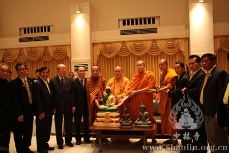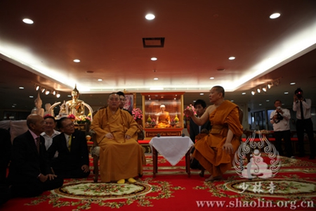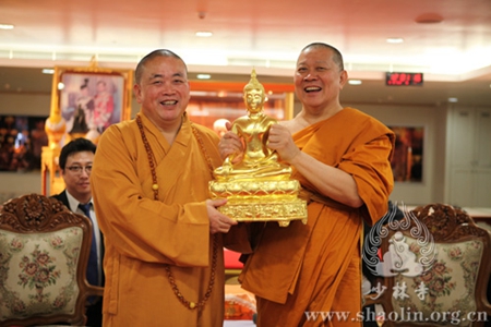 当地时间2014年12月16日上午10时,由少林寺方丈永信法师带领的少林文化代表团一行八十余人抵达位于泰国首都曼谷的金佛寺,与泰国副僧王Som Dej Phra Putta Chan 和金佛寺副住持赵昆通猜法师(Phra Prom Mung Kla Chan)进行系列佛教文化交流活动,受到了副僧王、副主持以及金佛寺两序大众的热烈欢迎。