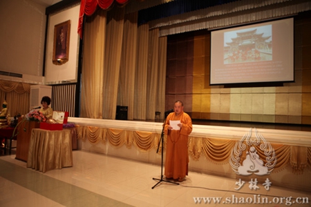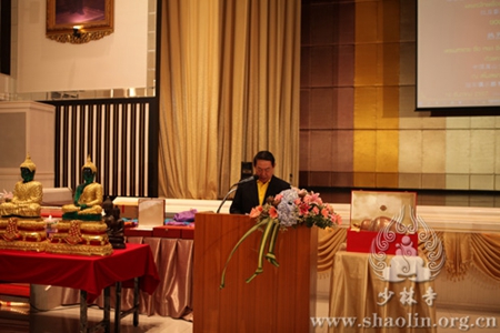 在欢迎仪式上,泰国金佛寺副住持赵昆通猜法师(Phra Prom Mung Kla Chan)介绍了此次少林寺受泰国政府邀请参加浇铸佛像活动的重要意义,以及泰国岱密金佛寺的缘起、发展历程、在泰国历史上的重要性,以及金佛寺在文化和教育方面所做出的贡献。