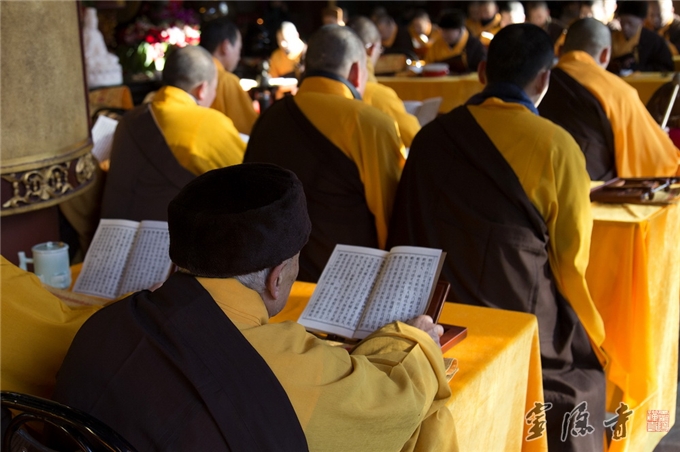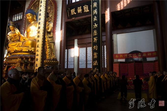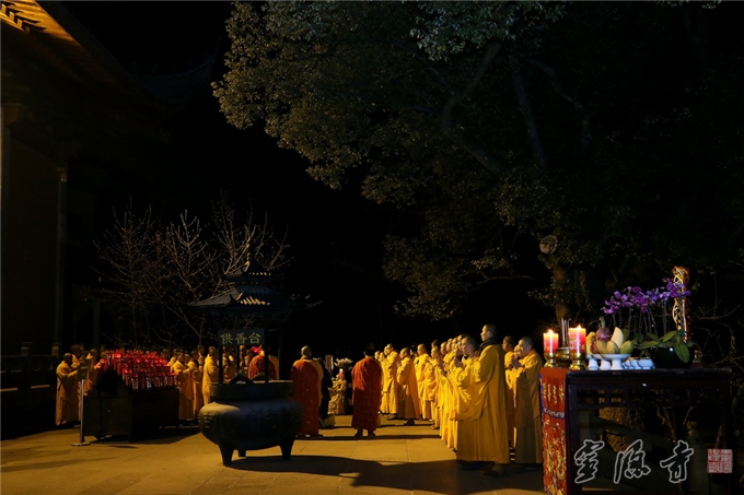 2014年12月22日,为时7天的灵隐寺冬至佛七圆满,当晚在药师殿举办了殊胜的三大士瑜伽焰口法会。主法法师结密印、诵真言、意观想、振法铃,奉请幽冥教主本尊地藏王菩萨等,引领斋主亲属亡魂及各路孤魂野鬼,赴此坛场听法受食。法师们及护法居士、信众虔诚诵念,随喜参加。法会如法如律,坛场清净庄严。