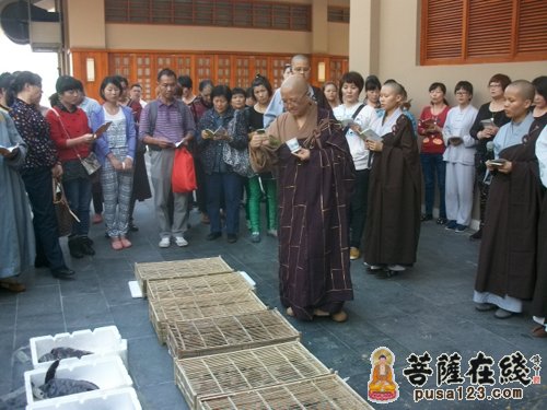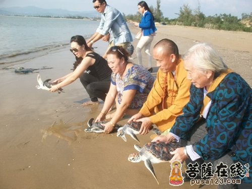 菩萨在线海南讯 2014年12月10日至11日,海南300余名四众弟子满怀大欢喜心,在海南省佛协副会长、海口泰华庵住持释成道法师的带领下,驱车300多公里,远离城市的喧嚣,前往三亚南山文化旅游区,吃斋念佛,礼拜海上观音、祈福并放生,让大家同沾法喜。