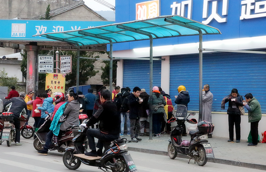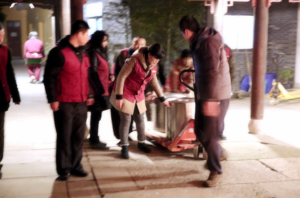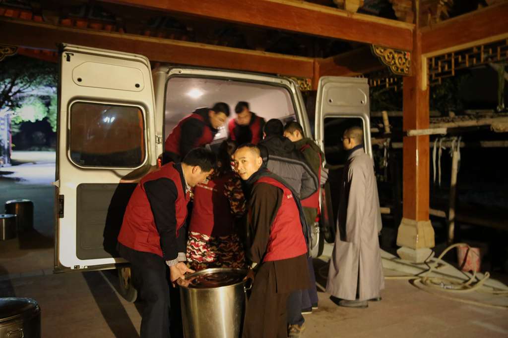 在忙碌了一个通宵后,四众弟子们将腊八粥运往瞻岐镇,给人们送去吉祥的祝福。